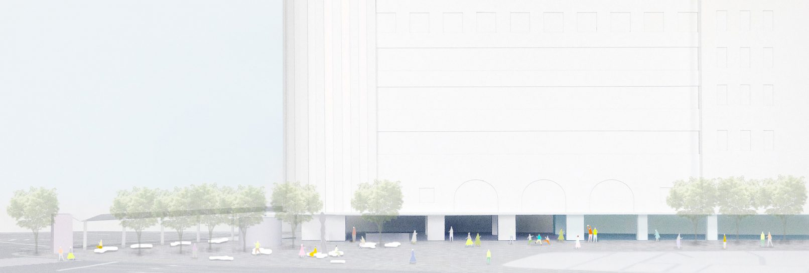 神戸三宮「さんきたアモーレ広場」デザインコンペ応募案。神戸阪急ビル東館の建替にあたり広場を工事ヤードとして使用されていたが、神戸阪急ビル東館の開業にあわせアモーレ広場が復旧されることとなり、神戸の玄関口にふさわしい、より多くの人に愛される空間となるような広場への再整備が求められた。新たに象徴的なものをつくるのではなく、まちと駅を緩やかにつなぐ「余白」となる部分をつくることを提案した。神戸阪急ビル東館の計画からも建物北面がメインエントランスとなることが読み取れ、建物の正面性と広場の玄関口としての印象を強めるため、何も無いがらんとした余白となる空間を計画した。広場を覆うような工作物や植栽、固定のファニチャーなどを設けない事で、まちと駅を緩やかにつなぎ、開放的で余裕のある新しい広場を提案した。