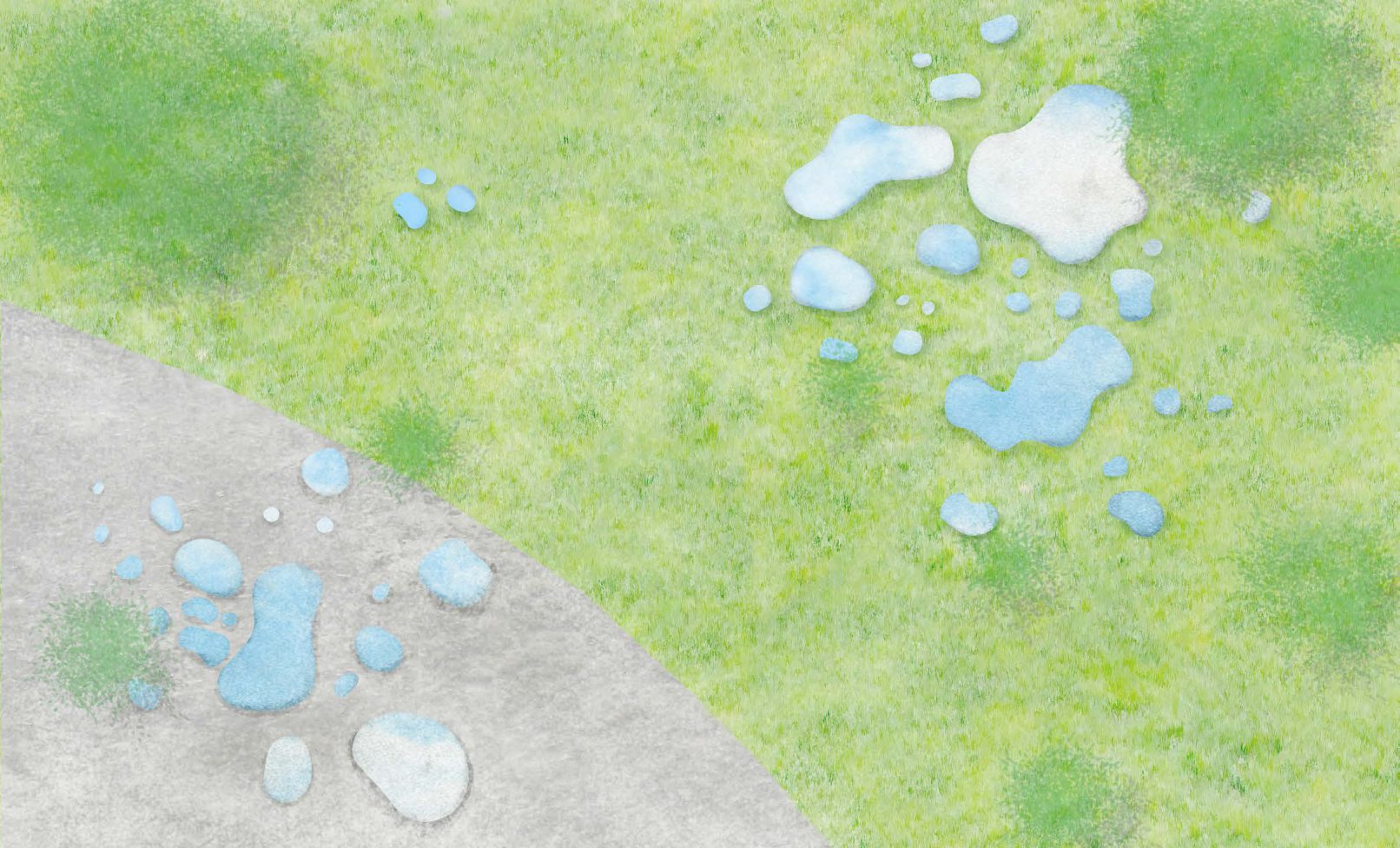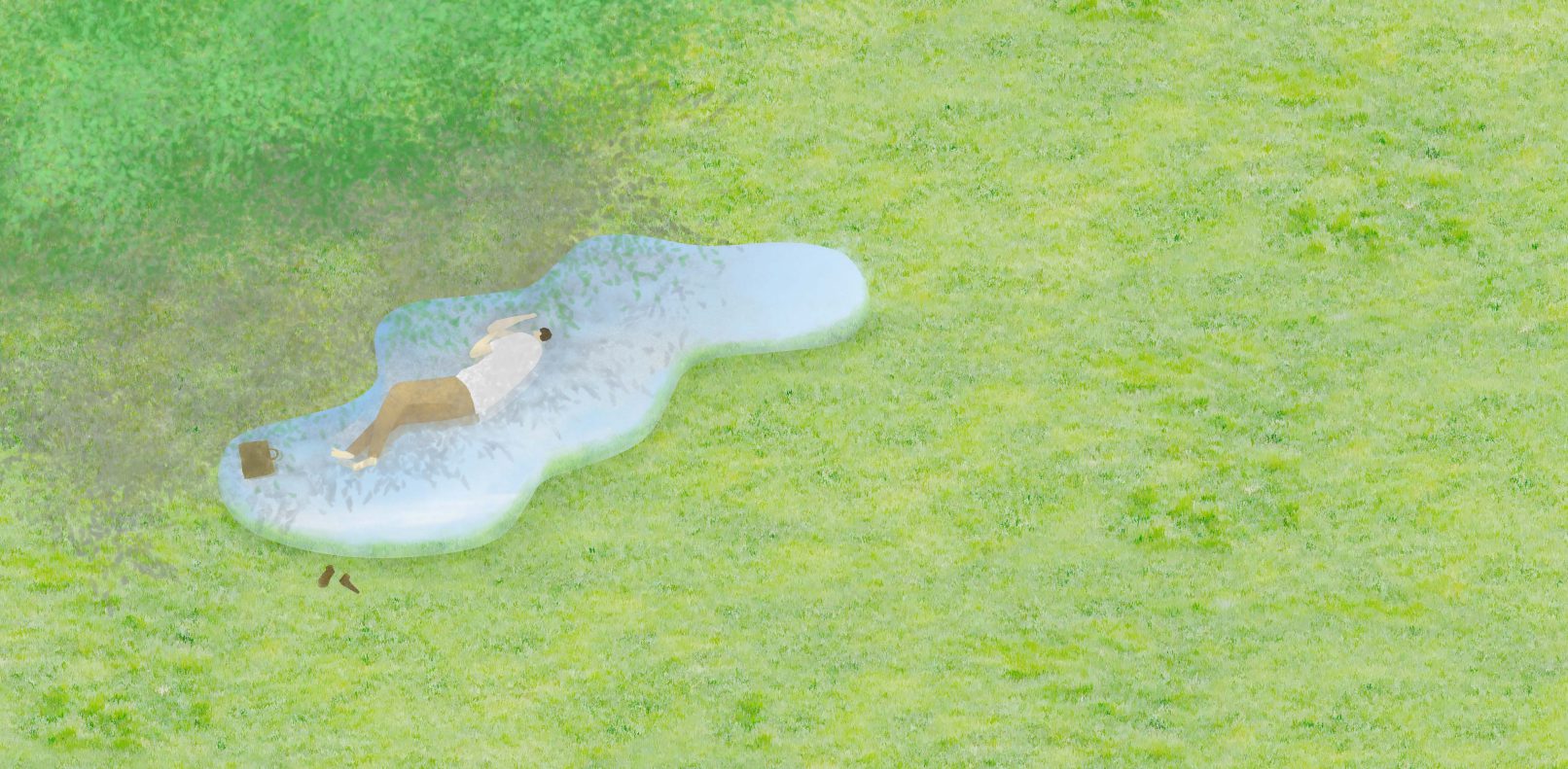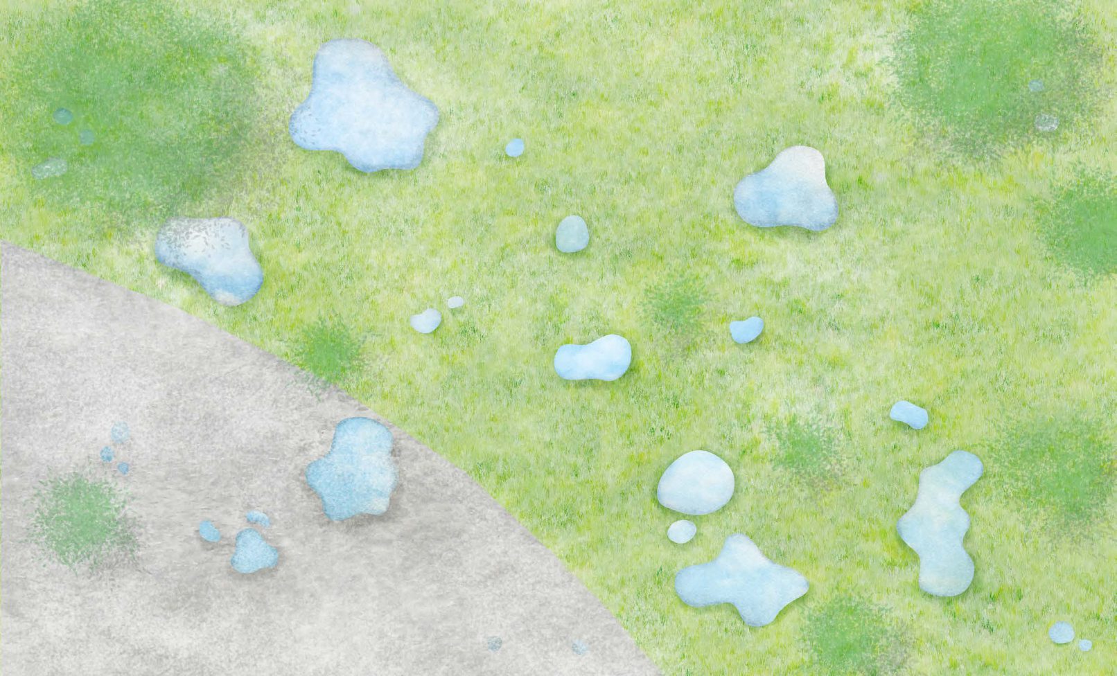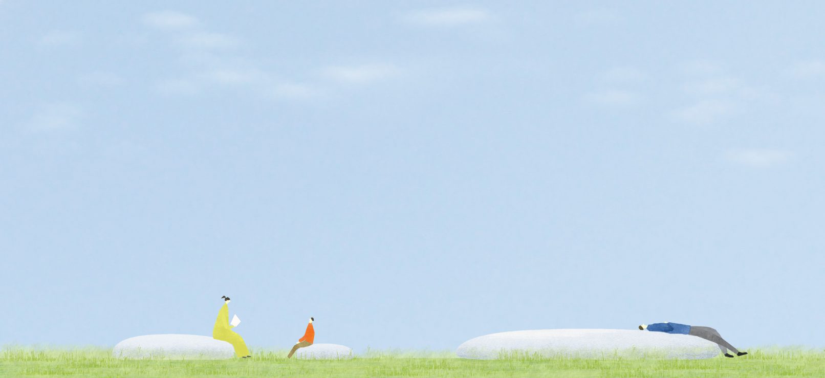 水滴のような家具をつくる。大きなものはベットやソファーのように、小さなものはスツールのようになる。半鏡面仕上げとすることで風景が柔らかく映り込む。集めたり分散させたりすることで、緑地の中に様々な場所や空間ができる。