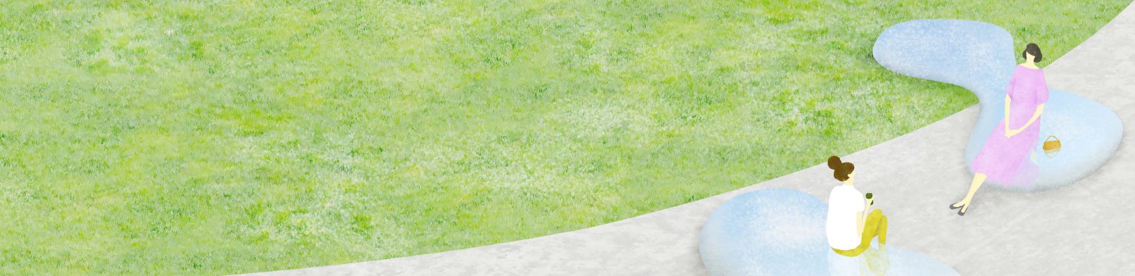 A plan to make furniture that looks like water drops. The large ones are like a bed or a sofa, and the small ones are like a stool. The semi-mirrored finish softly reflects the landscape. By gathering and dispersing the pieces, various places and spaces are created in the green space.