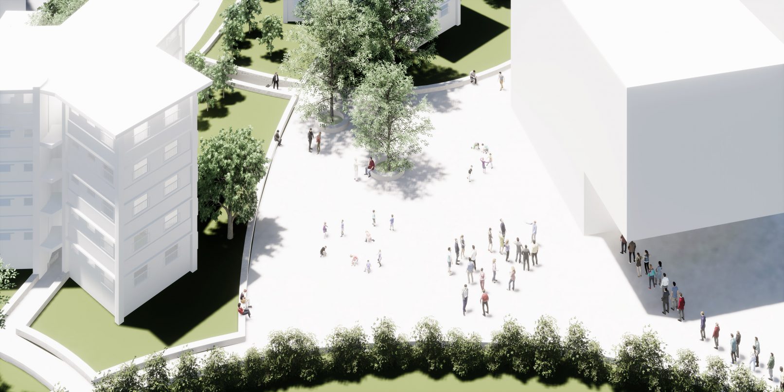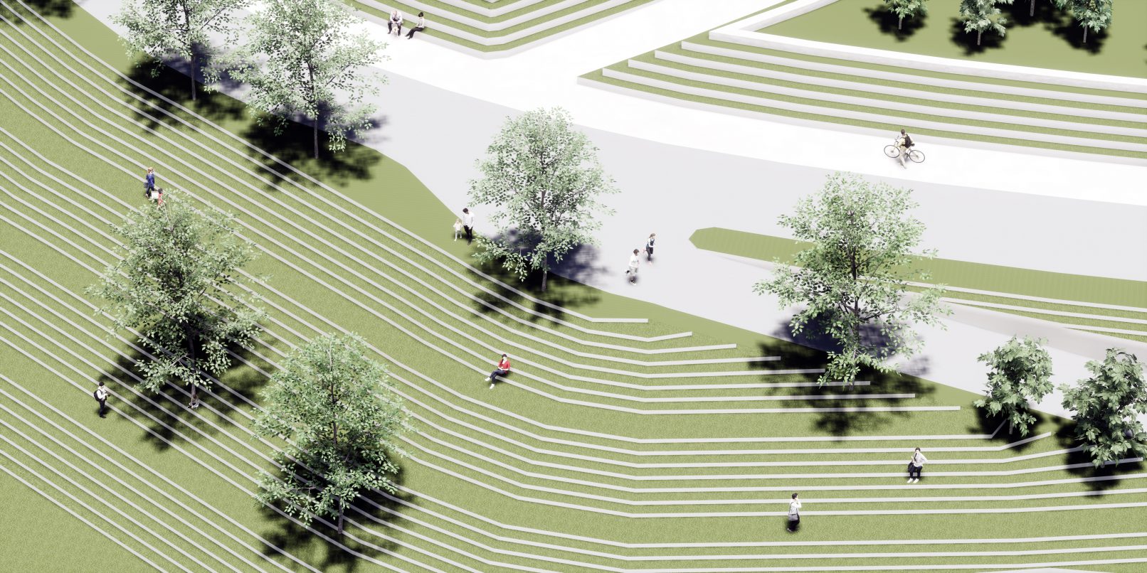赤羽台は高台にあるため、周囲には階段や坂(スロープ)が数多く設けられている。また階段等を上がった上部の地区内にも細かな高低差があり、それを解消するための階段が数多く見られ他の地域よりも「階段」が日常に溶け込んでいるように感じた。既に建替えられた地域でも「階段」を積極的に意匠に取り込んでいるように思える箇所が散見され印象的で、さらに現在、赤羽台周辺地区のゲートウェイとして赤羽駅側の擁壁の一部を撤去し、階段やバリアフリーのアクセスルートをつくる計画・崖線区道の再整備計画も進んでいる。そこで高低差のある崖線部に「階段」を手掛かりにしたデザインのパブリックスペースを提案した。
