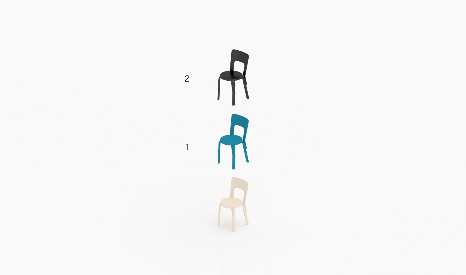SKWAT/ARTEK主催コンペティション応募案。ARTEKのさまざまな展覧会やディスプレイに使われてきた5種類の家具たちに、新しい価値を付加し新たなカタチに転換することが求められた。artekの「One Chair is Enough」の精神や、2nd cycleの「年月を経た美しさを維持する為に最低限の補修・クリーニングのみを施す。個々の特性を楽しむ。」という考えに共感し、Chair66の完成された形状を変えるのではなく、長く使うことでより変化を楽しめるようなリデザインはできないかと考えた。塗装の下に別色を塗装しておくことで、長く使い込む中でのキズやこすれ等により、徐々に下の別色が現れ変化する。