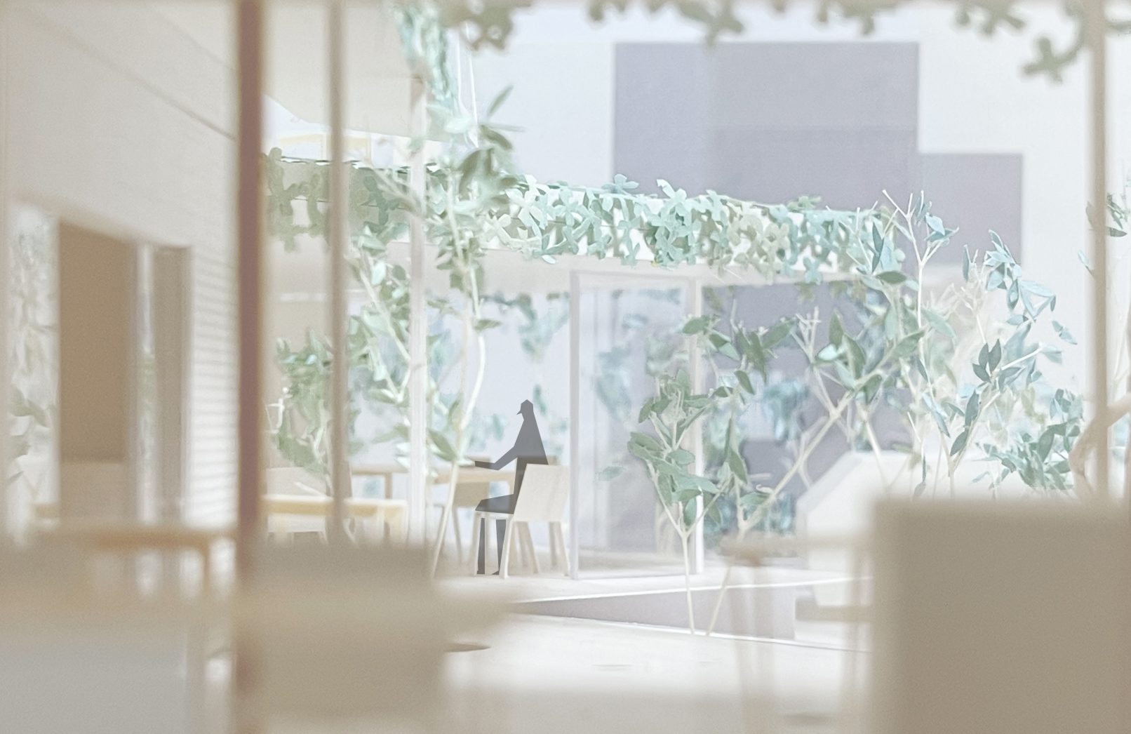 「立ち寄りたくなる、おおらかなお家」というコンペのコンセプトや、いちでの活動・敷地を実際に見学し、全く新しいしつらえにしてしまうのではなく「現状の雰囲気を残し、拡張していくような建築」がこの場所にあっているように感じた。 そこで、現状の庭の雰囲気を壊し過ぎないよう、庭に対する適当な大きさを検討した結果、 高さを抑え、10 坪よりもコンパクトな建築にしたいと考えた。コンパクトながらも様々な使い方のできる建築とする。家族の高齢化や変化、いちの活動の変化に寄り添えるよう、また長期的な時間の経過を楽しめる建築となるよう、機能性と経年変化に配慮し設計を進めたいと考えている。