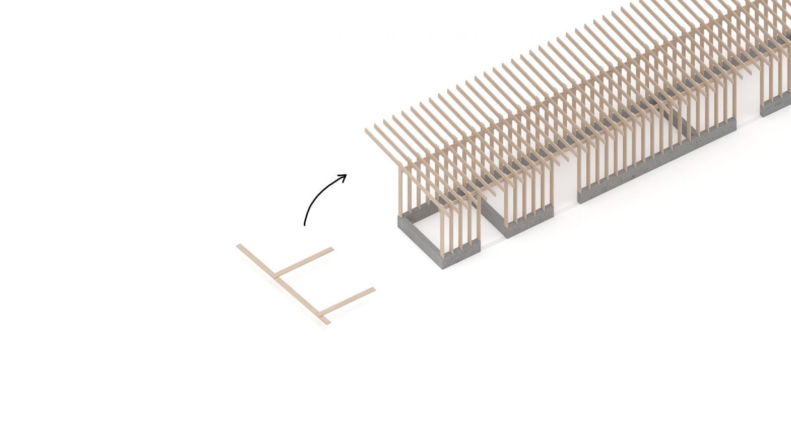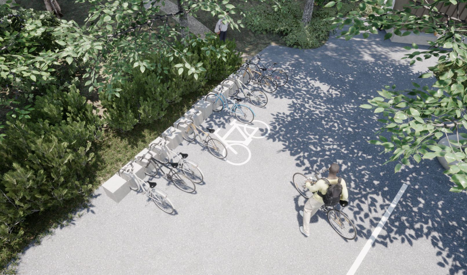 This is a proposal submitted to a design competition as part of the Kumamoto Art Police Project. “The site is one of the few places in the park with a parking lot and toilets. The proposed site is the starting point of Observation Course B. It is also one of the few places in the park that has a parking lot and toilets, and is positioned as one of the bases for walking. In this project, we thought it would be appropriate not only to rebuild the restrooms, but also to create a rest area, a parking space for bicycles, and a paved area for barrier-free access, considering the entire site as equivalent to a building. To avoid cutting down the tall trees, the building is set back from the trees to create a long and narrow shape, and a single-flowing roof with a 2-meter deep eave is placed on the south side to create a semi-outdoor space continuous with the space under the branches where the sunlight falls through the trees. On the north side, where the roof is lowered, we proposed an architecture that is integrated with the landscape.