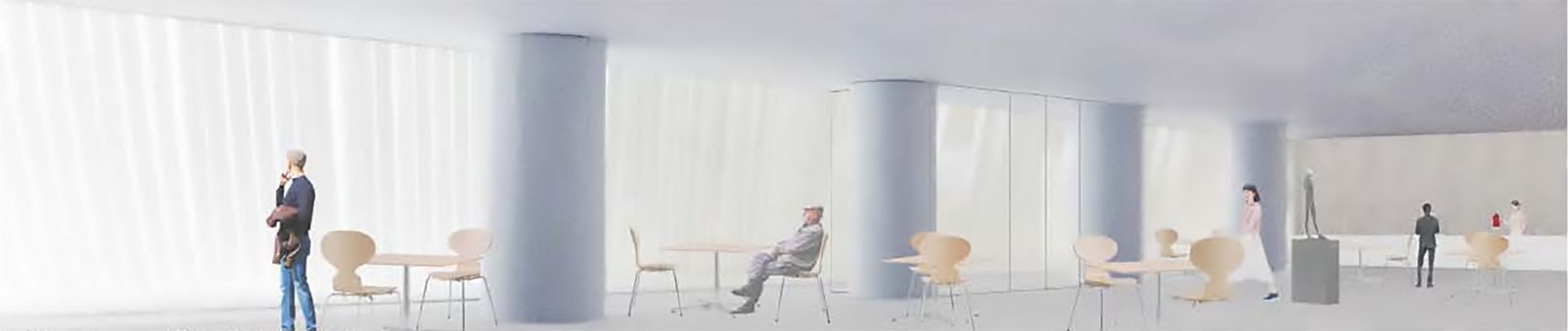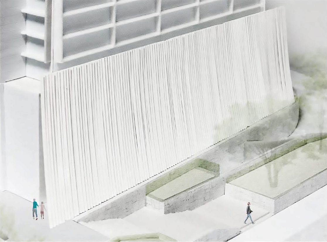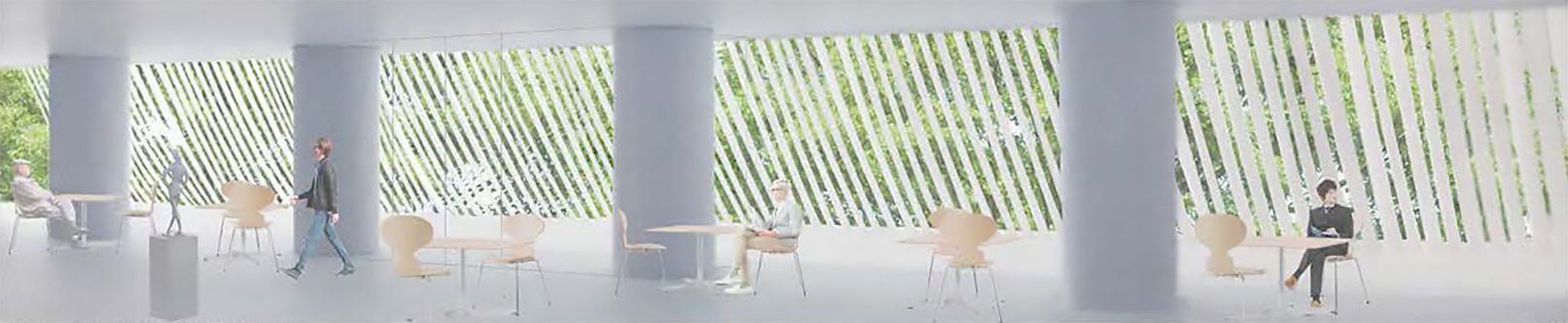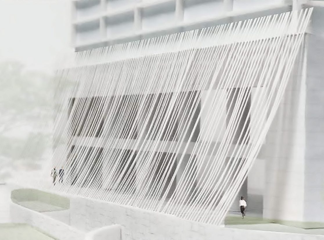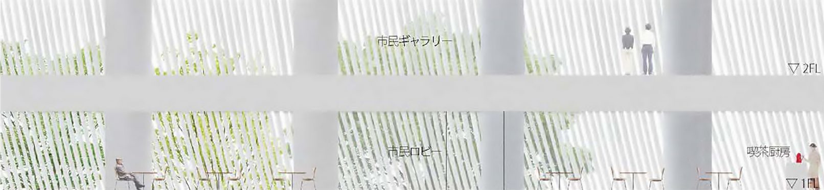 Proposal for the renovation of the citizens’ lobby on the west side of the first floor of the Kobe City Hall Building. Rather than a mere renovation of the lobby space, we wondered if it would be possible to propose a renovation that would connect the city of Kobe and update other spaces at the same time. Specifically, we created a new entrance on the west side of the building so that the city hall can be accessed from anywhere, east, west, north, south, and west. The roof is made of square pipes. In consideration of sunlight, square pipes are set up and fixed in place as they deflect under their own weight to create a structure that is both a soft raw silk-like monument and a sunshade louver.